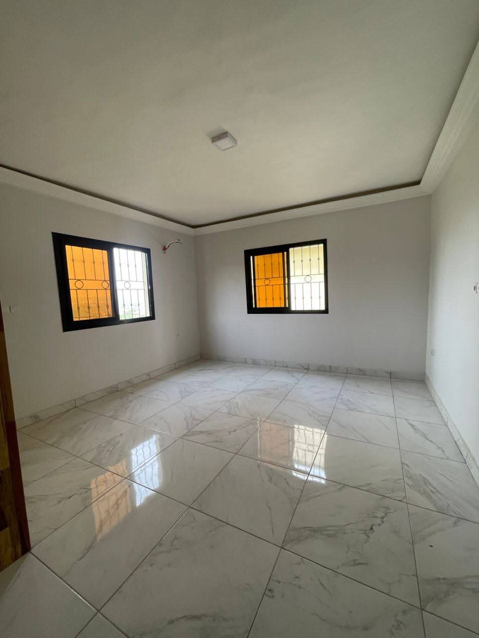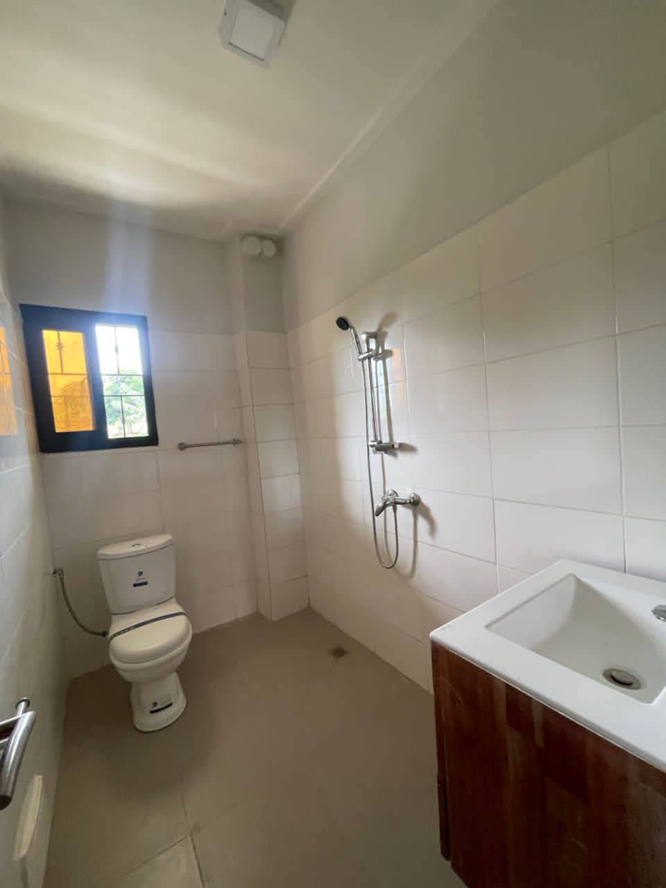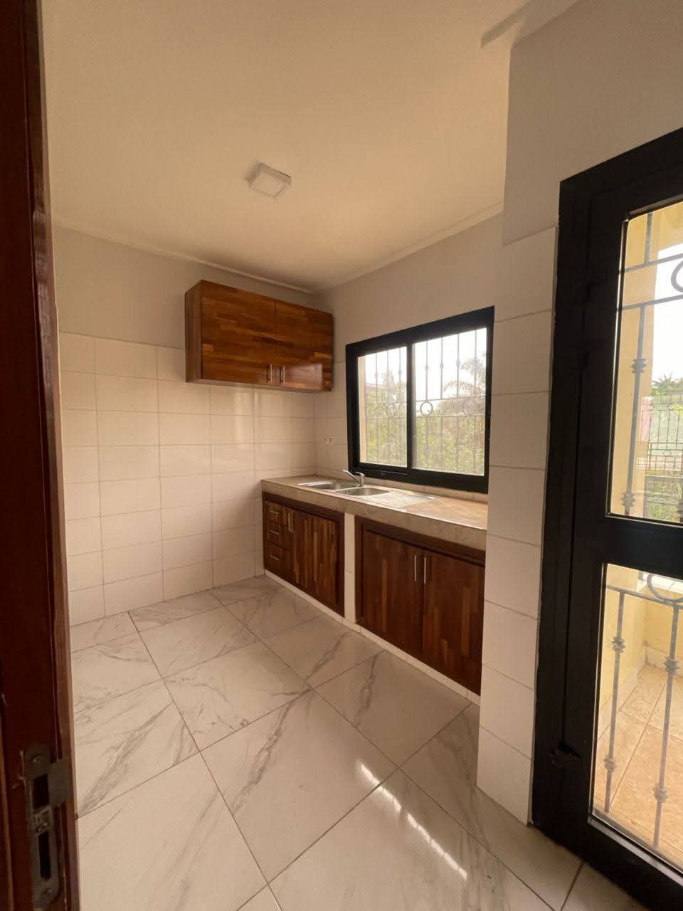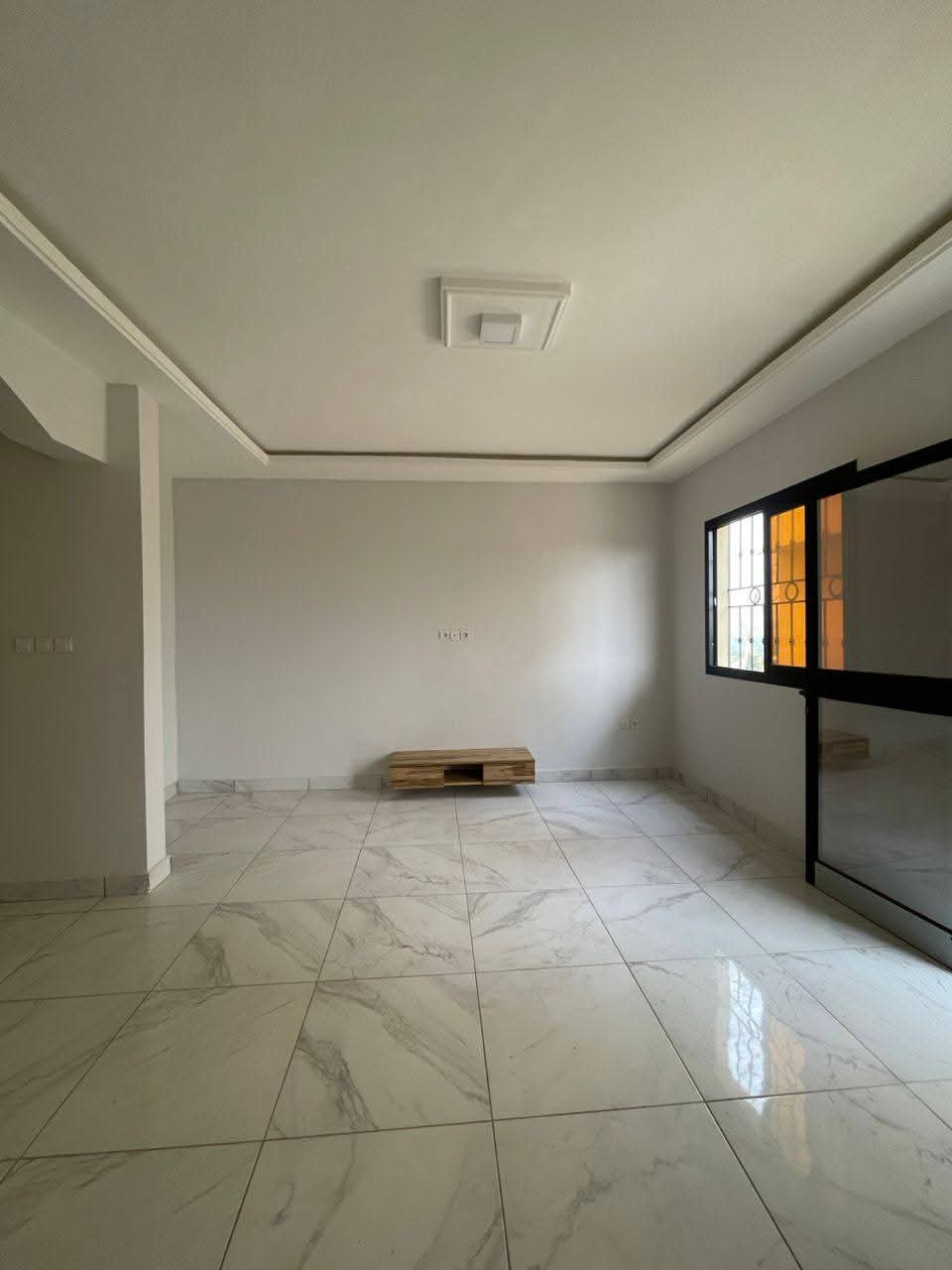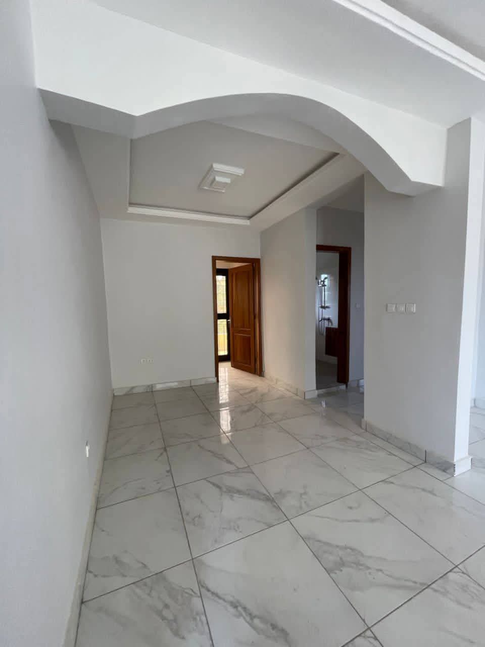 Mise en location d'un appartement moderne avec finitions soignées (sol carrelé, faux plafonds). Le bien comprend 2 chambres et 2 douches. L'immeuble dispose de commodités telles qu'un parking, un forage pour l'eau et un service de gardiennage.