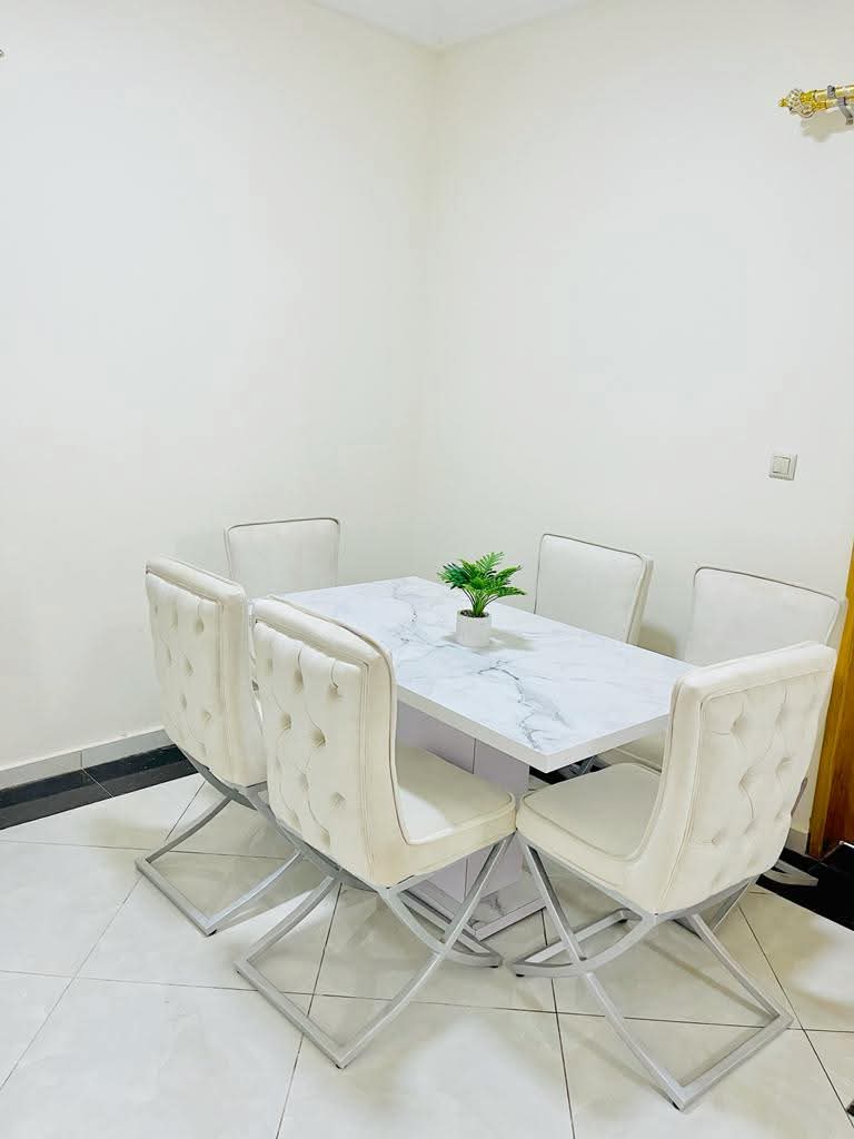 Appartements meublés disponibles à la location, composés de 2 chambres et 2 salles de bains. Le logement dispose d'une cuisine bien équipée (réfrigérateur et cuisinière visibles sur les photos) et d'un coin repas moderne avec table et chaises blanches. Les services incluent un parking privé sécurisé, une connexion Wi-Fi et une sécurité assurée 24h/7j. L'immeuble présente une architecture à étages avec balcons.